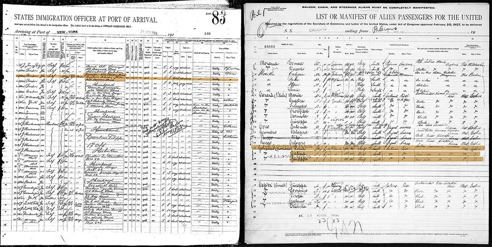 Ship manifests of my great-grandfather Giuseppe (1914) and grandmother Giuseppa (1918), marking their journey to the U.S.